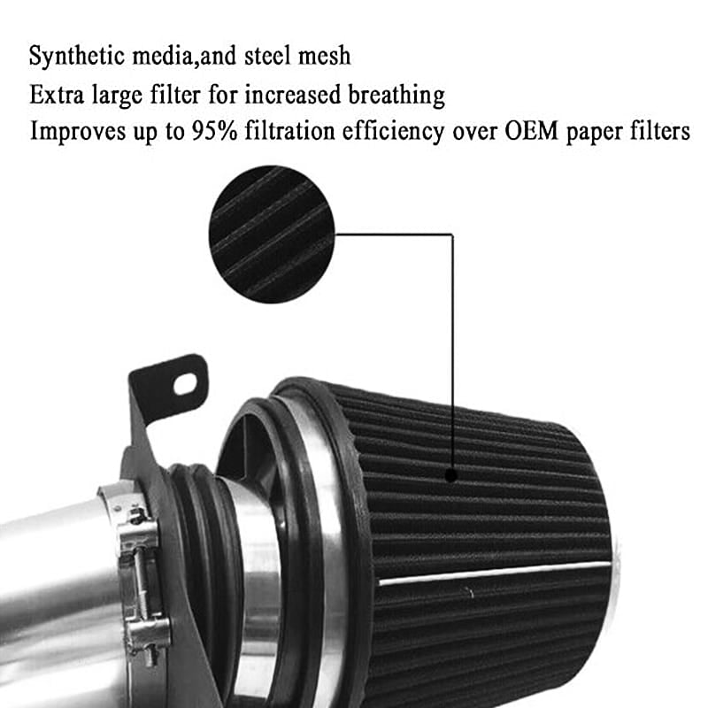- 【Dry Air Filter】Each intake kit comes with a huge, highly efficient air filter which results in better performance and better protection for your engine. Our filter do not require oil, it is reusable and washable. You can wash it with soap and water, rinse it until it is all dry up, and use it again. We recommend you check every 5,000 miles to see if it needs to be washed/cleaned.