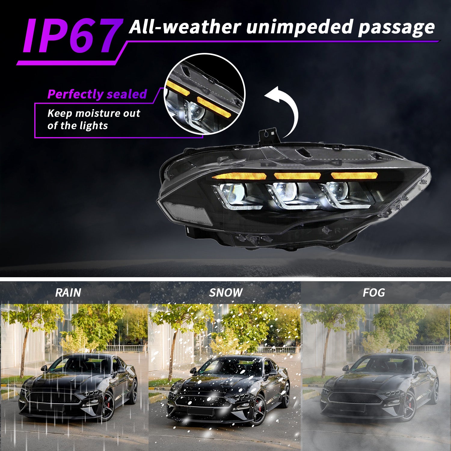 For 2018–2023 Ford Mustang LED Headlights – S650 Style Triple Beam Projector Lamp Assembly (Pair)