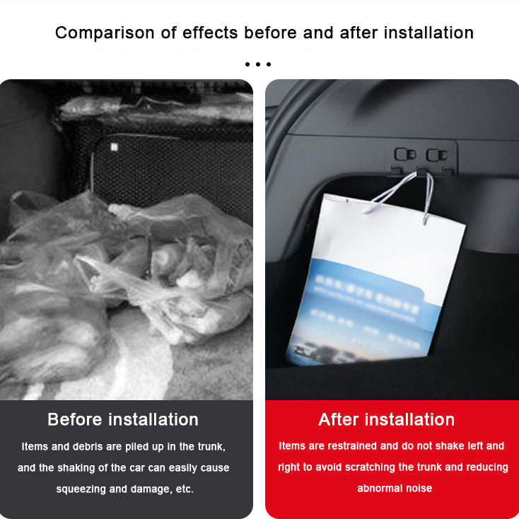 - Tesla Model Y Trunk Space Optimization,Transform your trunk into an organized haven. Our hooks maximize space usage, allowing you to keep your car clutter-free while carrying all you need.