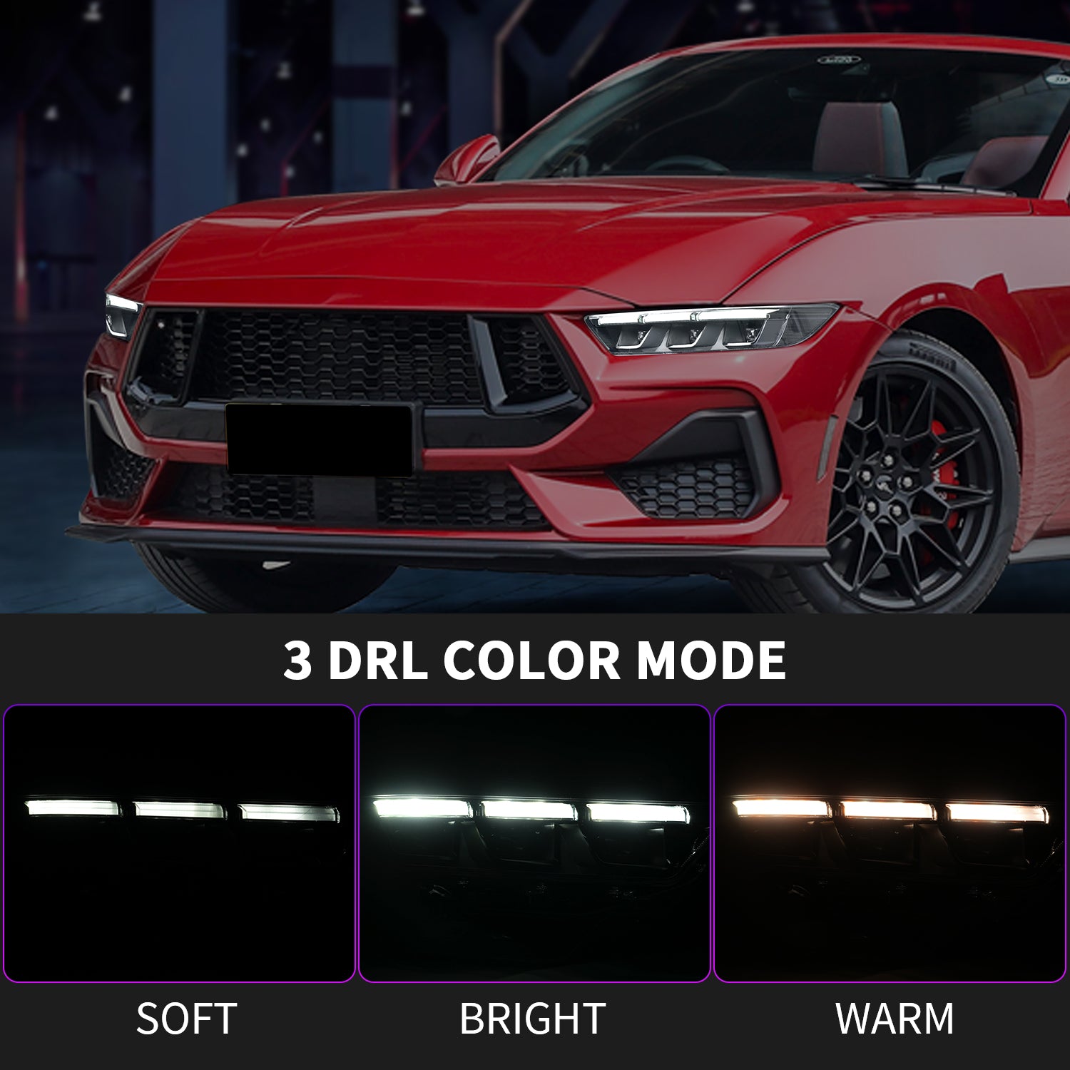The Ford Mustang headlights have six different lighting effects, including warm daytime running lights, white daytime running lights, high-brightness white daytime running lights, low beam, high beam, and turn signals.