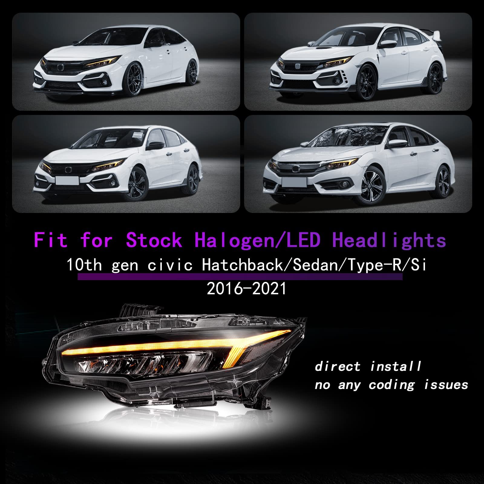 LED Headlights for 2016–2021 Honda Civic 10th Gen Sedan/Coupe/Hatchback – Sequential Turn Signal, Full LED Assembly, Fits EX/LX/Sport/Touring/Si/Type R