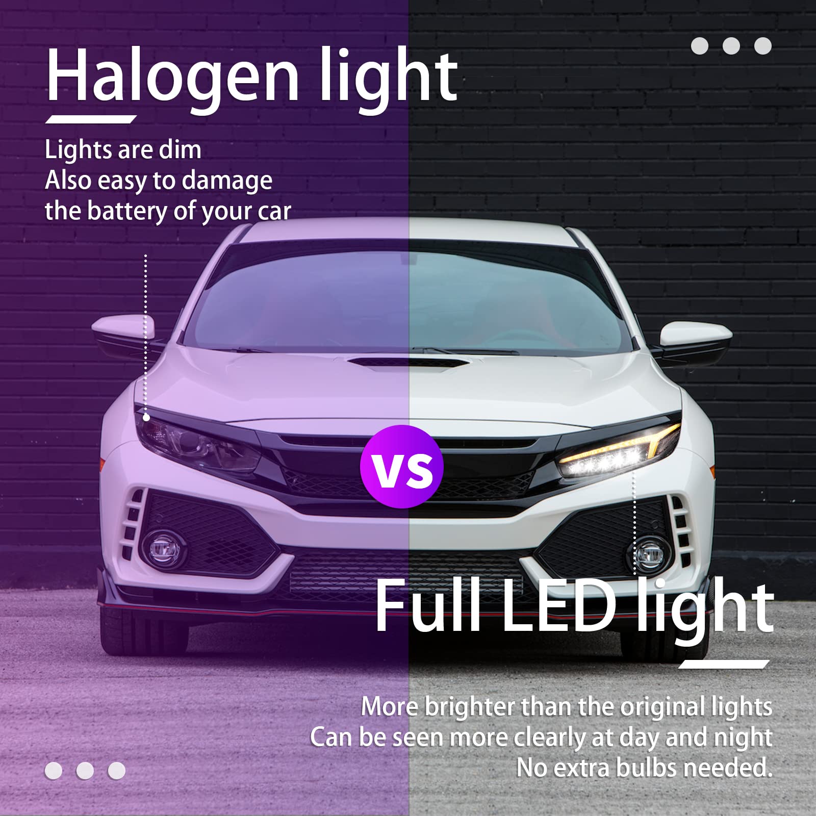 The Honda Civic 10th Gen headlights offer five lighting effects: white DRL, blue Start-Up Animation, low beam, high beam, and sequential turn signal.