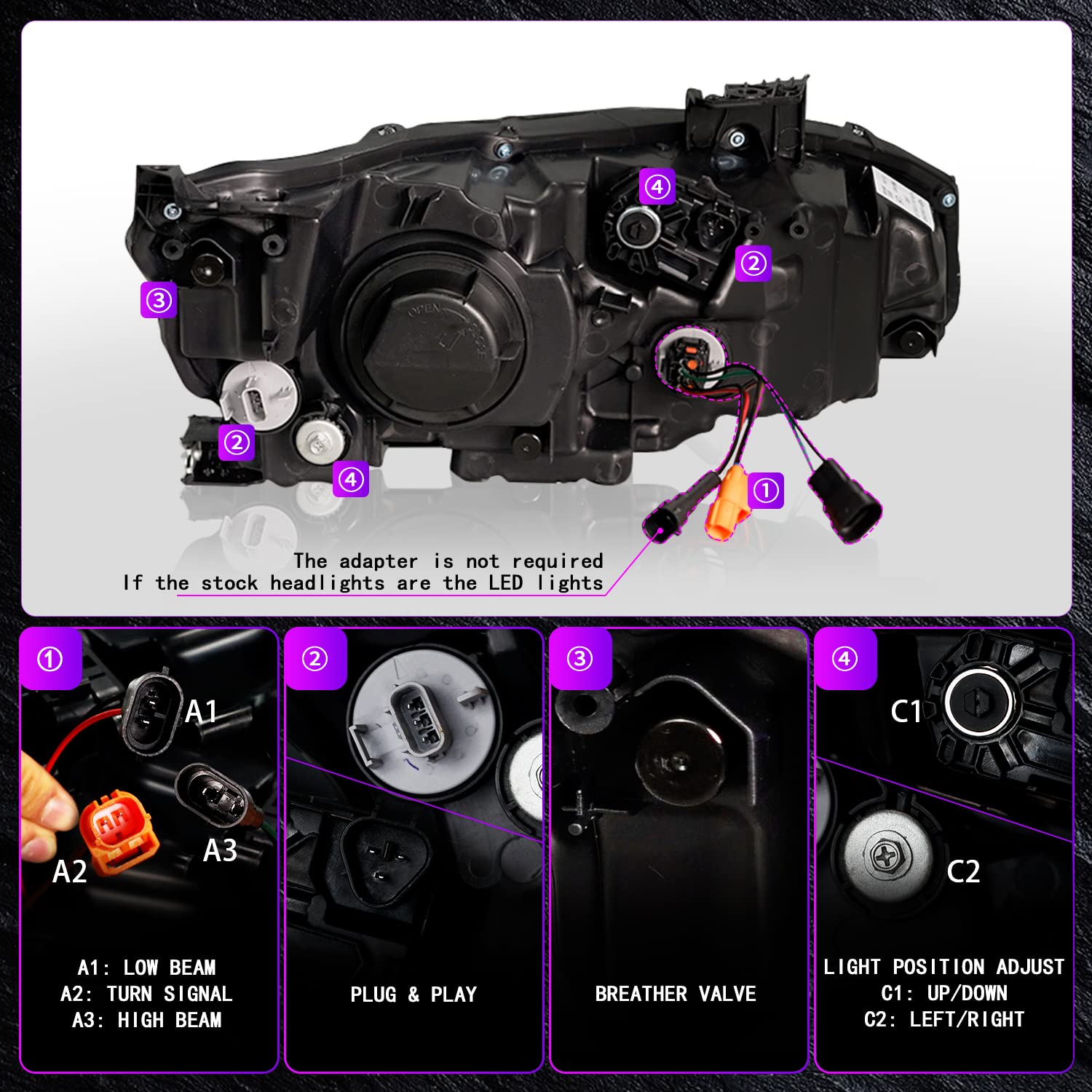 These LED headlights are high-performance, factory-style replacements that are easy to install without any electrical modifications.